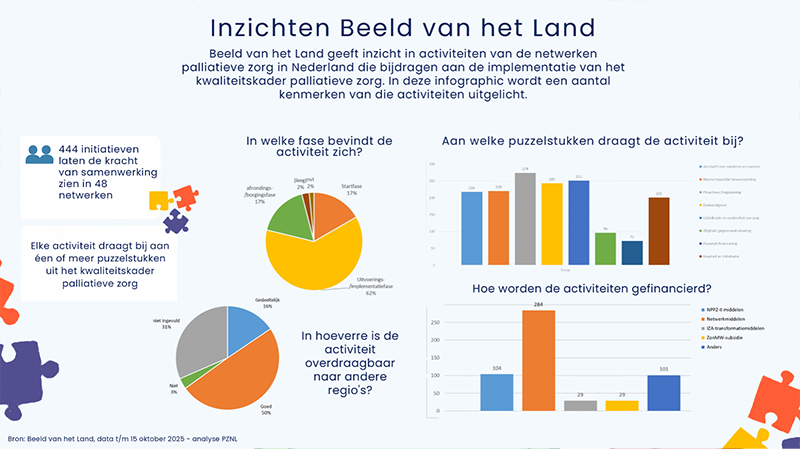 Beeld van het Land geeft inzicht in activiteiten in de netwerken palliatieve zorg in Nederland die bijdragen aan de implementatie van het kwaliteitskader palliatieve zorg. In deze infographic wordt een aantal kenmerken van die activiteiten uitgelicht. Door de kenmerken op landelijk niveau te presenteren, worden trends zichtbaar die kunnen helpen bij het identificeren van succesfactoren en bij het ondersteunen van beleidsvorming.