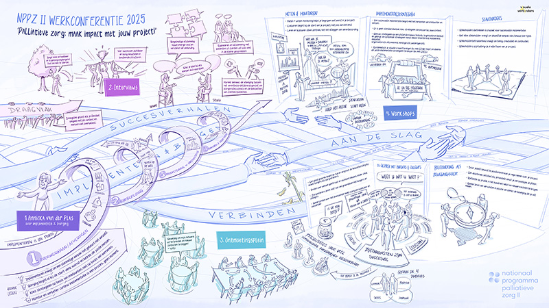 De dag begon met een plenaire presentatie van Annicka van der Plas (Amsterdam UMC) over de vier fasen van succesvolle implementatie en borging. Daarna vertelden twee projectleiders uit de palliatieve zorg hoe zij obstakels overwonnen en blijvende impact realiseerden in hun werk. In de middag gingen de deelnemers zelf aan de slag tijdens interactieve workshops over onderwerpen zoals Meten en monitoren, Implementatiestrategieën, In gesprek met de burger en met je collega’s, Stakeholders betrekken en Positionering. Hieruit kwamen allerlei inzichten en lessen naar voren die zijn samengebracht in een visueel verslag, zie hieronder (klik op de afbeelding voor een grotere versie).