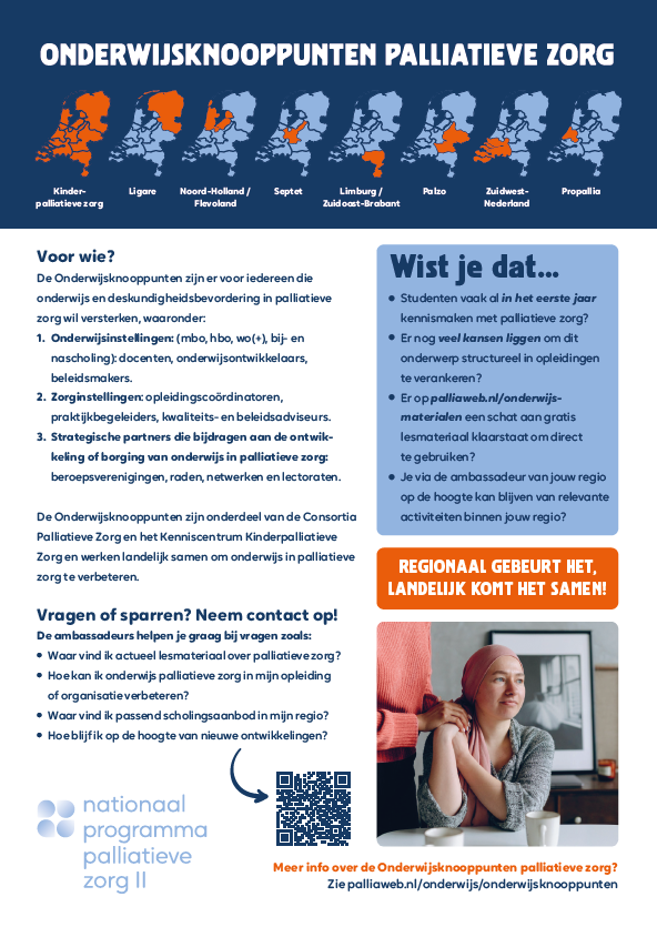 Het Onderwijsknooppunt Palliatieve Zorg van Propallia is de plek waar vertegenwoordigers vanuit het mbo, hbo, wo onderwijs, bij- en nascholing, patiënten en naasten, onderzoek en zorgpraktijk bij elkaar komen met als doel de kwaliteit van de palliatieve zorg te verbeteren door in te zetten op onderwijs.