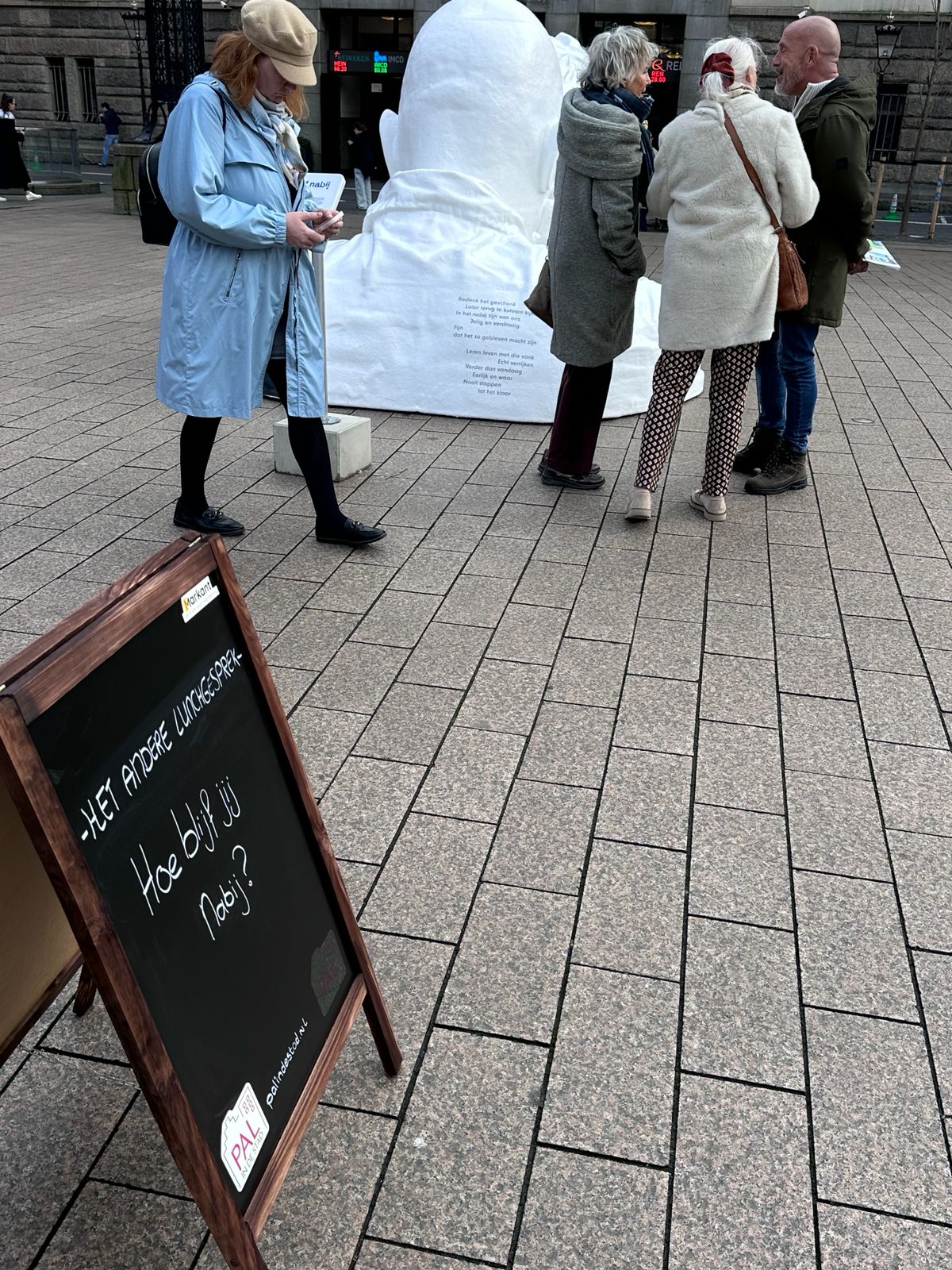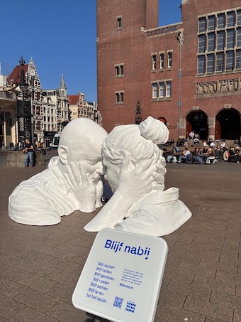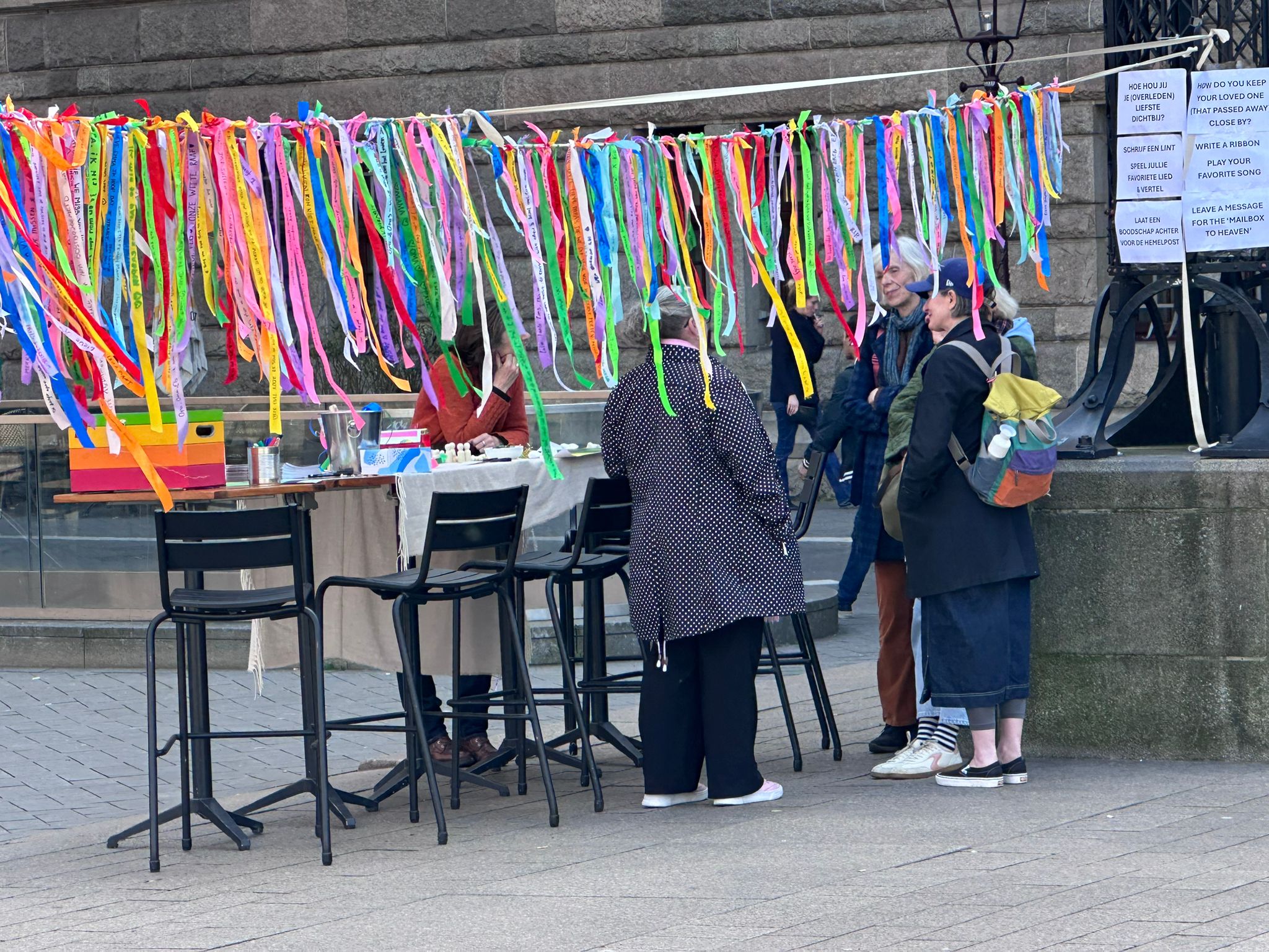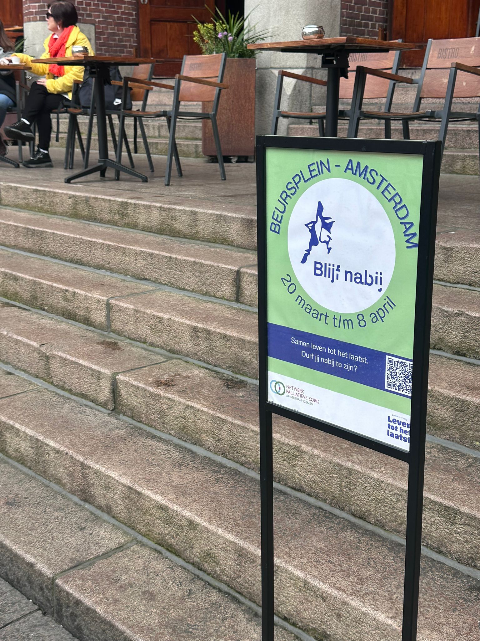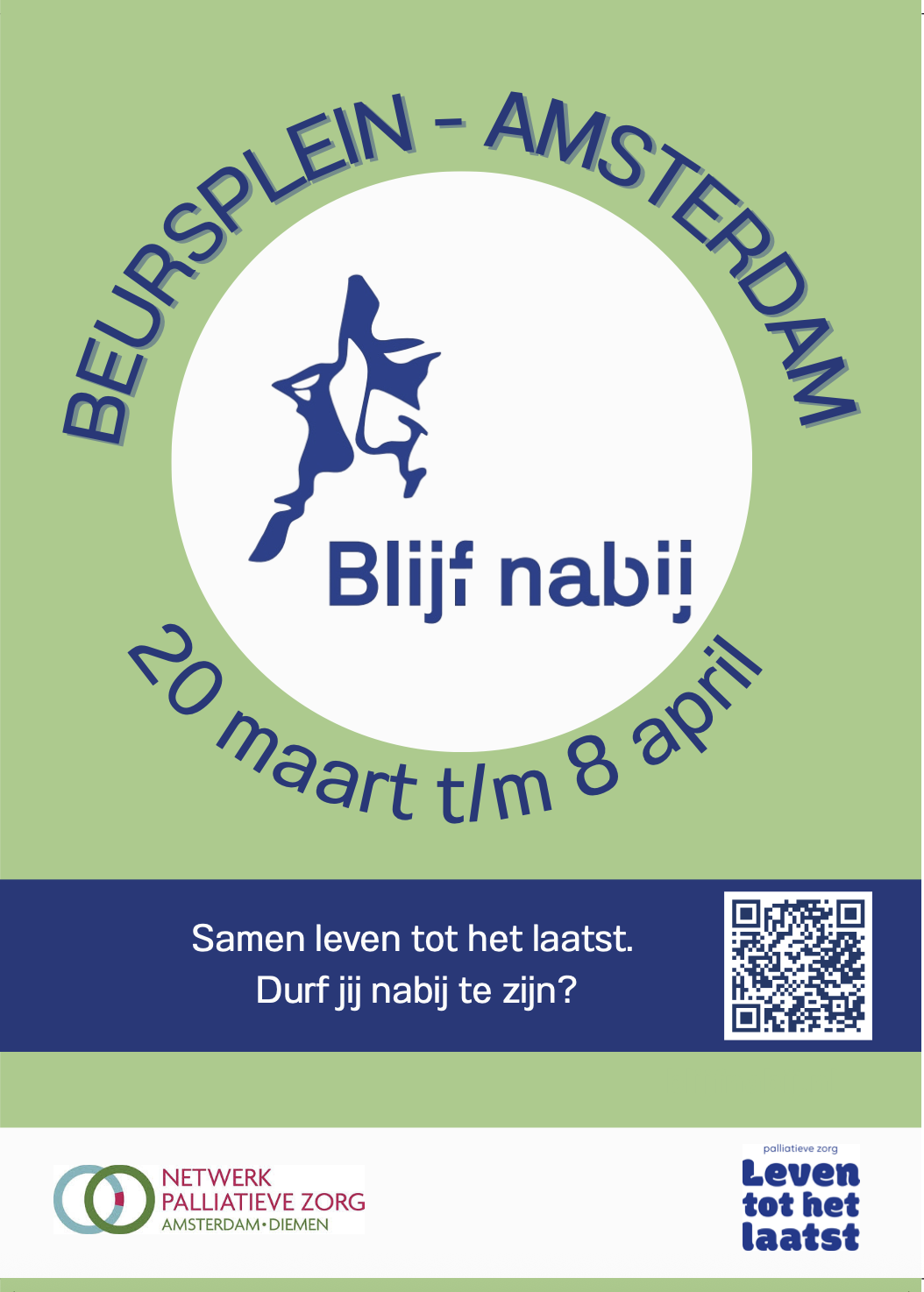 Van 20 maart t/m 8 april wordt op het Beursplein met een imposant kunstwerk aandacht gevraagd voor het belang van nabijheid in de laatste levensfase. Het kunstwerk, ‘Blijf nabij’, is gemaakt door Saskia Stolz. Drie weken lang staat Amsterdam en specifiek het Beursplein in het teken van Blijf nabij. Zo ziet dat er uit: