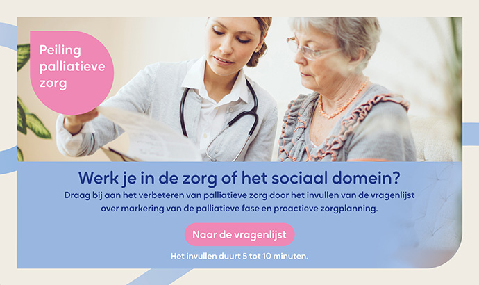 Werk je in de zorg of in het sociaal domein? Dan nodigen we je uit om mee te doen aan een korte tweejaarlijkse peiling om inzicht te krijgen in je ervaringen, kennis en opvattingen over twee belangrijke thema’s binnen de palliatieve zorg: markering en proactieve zorgplanning. Daarmee bedoelen we het herkennen van patiënten in de palliatieve fase en het voeren van gesprekken met patiënten en naasten over hun waarden, wensen, behoeften en behandelgrenzen.