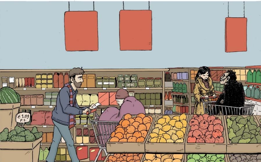 | Ook wanneer je als naaste even de deur uitgaat, bijvoorbeeld om boodschappen te doen, blijf je in gedachten bij de ander. Je metaforische winkelwagentje zit vaak vol met (mantel)zorg. Uit: ‘Naasten’ (p. 198-199) © Kranenburg, Van Ooijen en Haan (2019) |