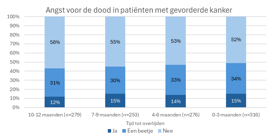 In totaal werden 629 patiënten met stadium IV‑kanker geïncludeerd in de prospectieve, multicenter eQuiPe‑studie, uitgevoerd in 40 Nederlandse ziekenhuizen (2017–2020). Patiënten vulden driemaandelijkse vragenlijsten in tot aan hun overlijden. Angst voor de dood werd gemeten met één item uit de Problem and Needs in Palliative Care vragenlijst (PNPC-sv), en daarnaast vulden 32 patiënten de Death and Dying Distress Scale (DADDS) in. Longitudinale resultaten werden verkregen middels een mixed-effect regressie model.