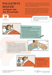 - Vertel de patiënt en naasten dat er voor hen informatie over palliatieve sedatie te vinden is op de website Overpalliatievezorg . Er wordt in begrijpelijke taal uitleg gegeven over wat palliatieve sedatie is, hoe het proces in z'n werk gaat en andere aspecten die voor de patiënt en zijn naasten van belang zijn. Deze patiënteninformatie is ook te downloaden als folder.