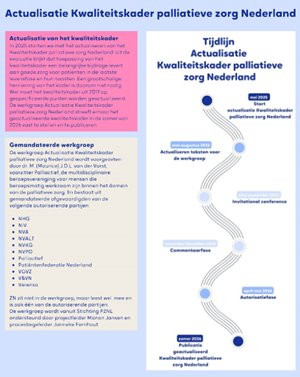 De werkgroep Actualisatie Kwaliteitskader palliatieve zorg Nederland streeft ernaar het op gespecificeerde punten geactualiseerde kwaliteitskader in de zomer van 2026 vast te stellen en te publiceren. Klik ook op onderstaande infographic: